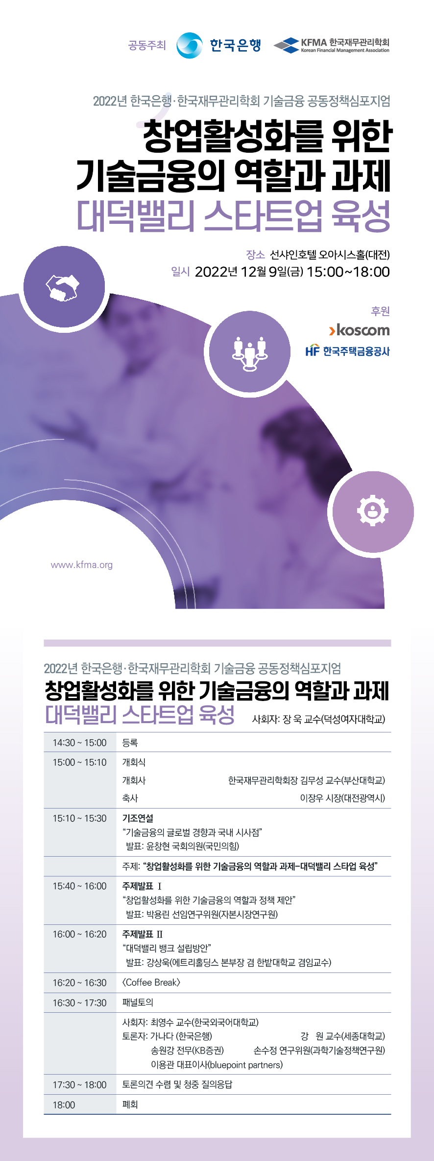 본 행사는 한국은행과 한국재무관리학회가 공동으로  2022년 12월 9일(금), 대전에서  아래와 같이 개최할 예정입니다.