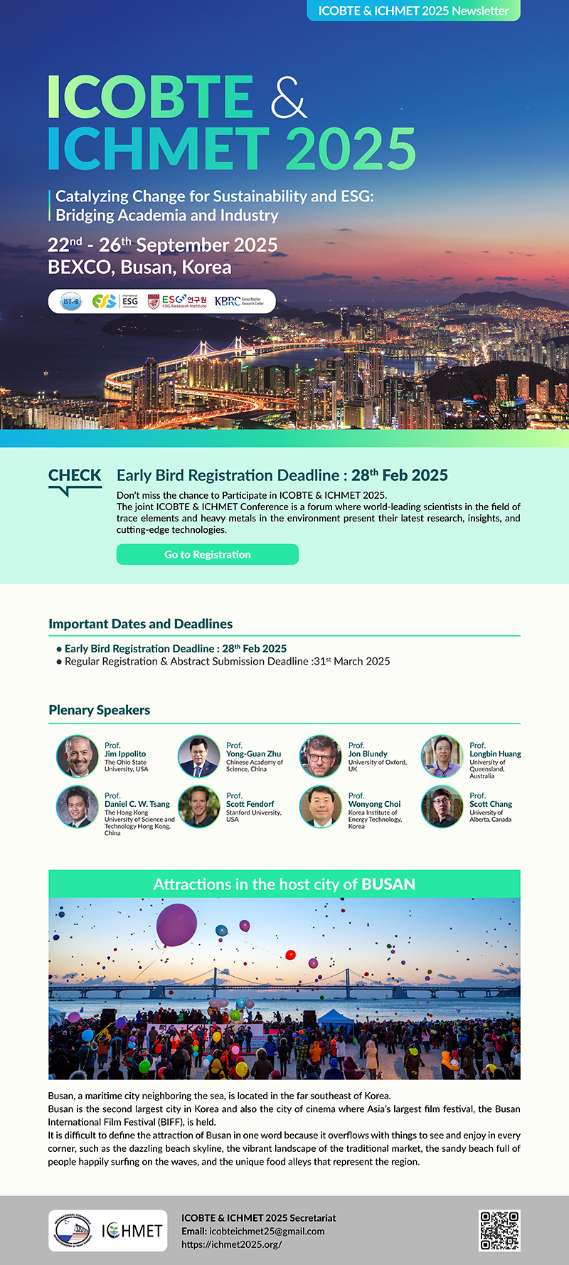 다가오는 2025 9 22()부터 26()까지 부산 벡스코(BEXCO)에서 미량원소 생지화학 분야의 세계 최대 국제학회인 ISTEB 주관으로 국제학술대회(ICOBTE)  환경  중금속 관련 국제학술대회(ICHMET) 개최될 정입니.
