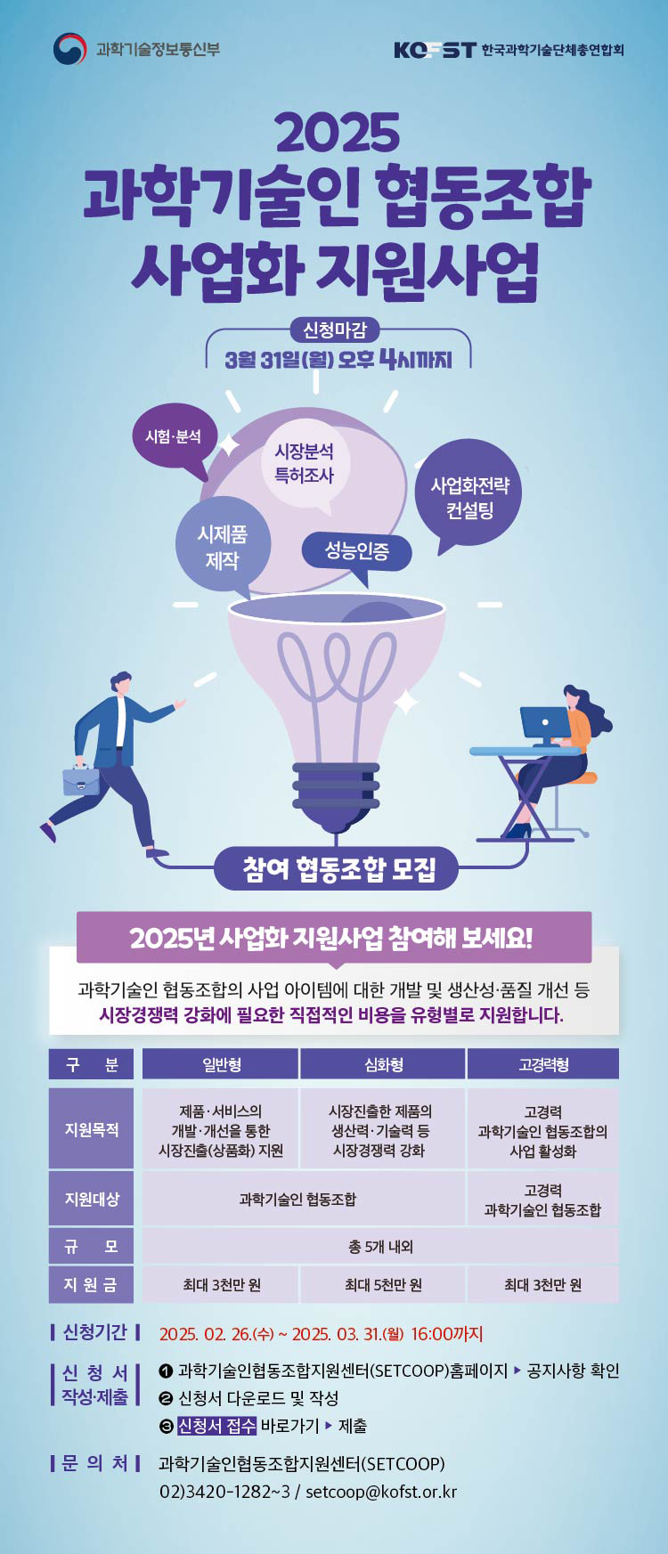 [과학기술인협동조합지원센터]2025년 과학기술인 협동조합 사업화 지원사업 참여 협동조합 모집공고(2/26~3/31)