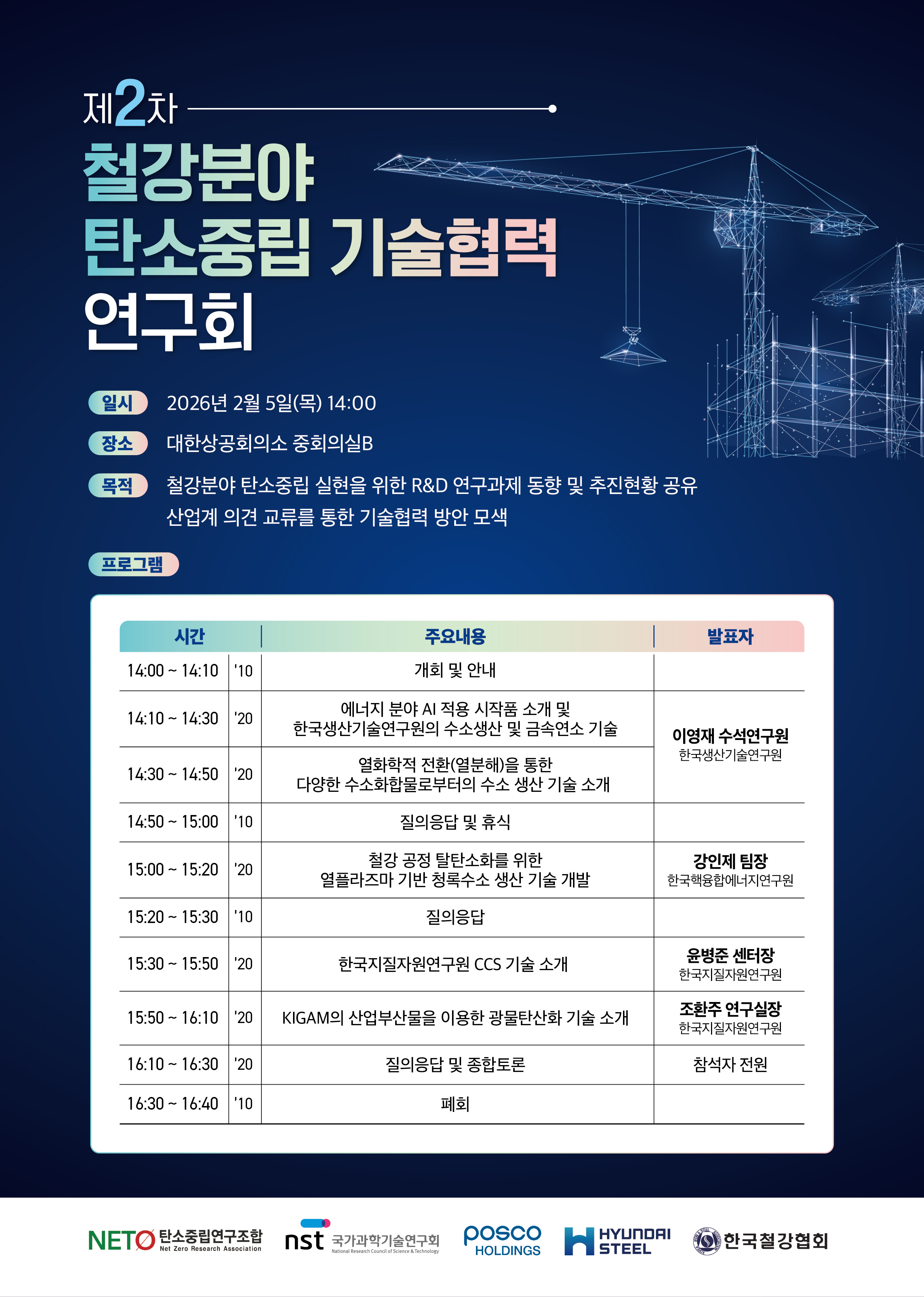 [탄소중립연구조합] 제2차 철강분야 탄소중립 기술협력 연구회 개최 안내(26. 2. 5(목) 14시, 대한상의 중회의실 B)