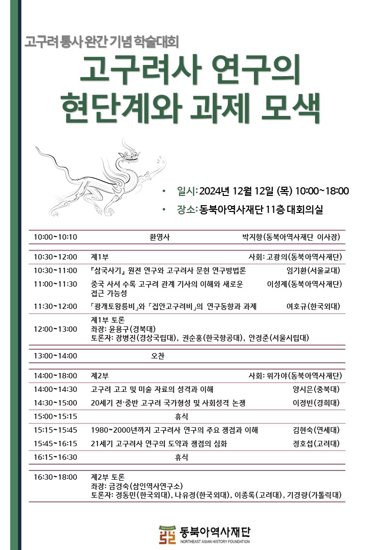 12월 12일 목요일에 고구려 통사(10완간기념 학술대회가 진행됩니다.