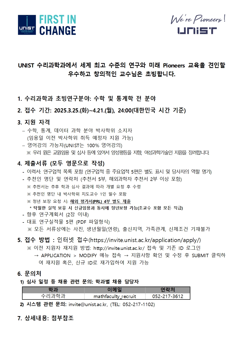 [채용]UNIST(울산과학기술원) 수리과학과(수학 및 통계학 전 분야) 2025학년도 전임교원 초빙공고